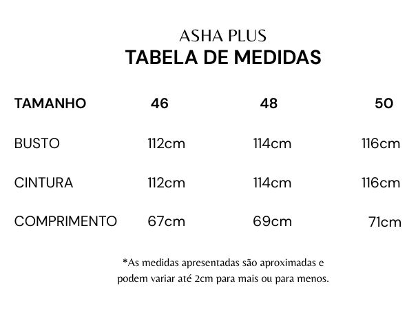 Medidas da modelo: Altura: 1,73m/ Busto: 108cm / Cintura: 91cm/ Quadril: 115cm (veste 46)