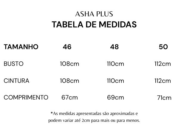 Medidas da modelo: Altura: 1,73m/ Busto: 108cm / Cintura: 91cm/ Quadril: 115cm (veste 46)