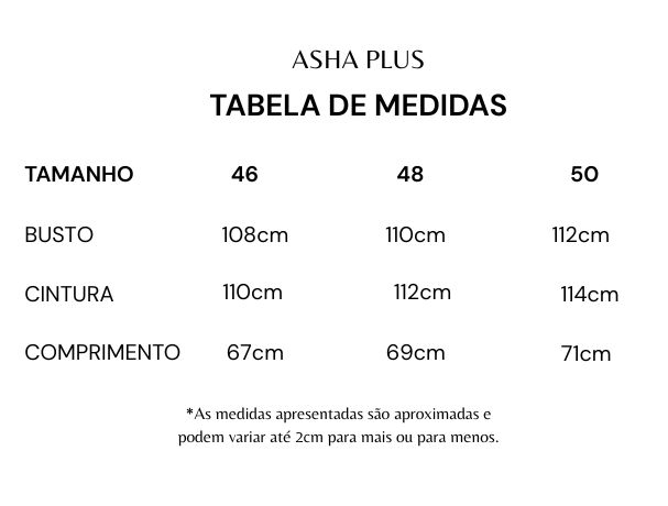 Medidas da modelo: Altura: 1,73m/ Busto: 108cm / Cintura: 91cm/ Quadril: 115cm (veste 46)