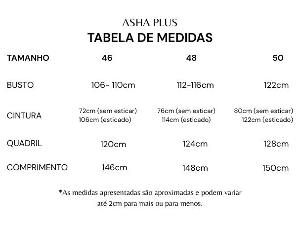 Medidas da modelo: Altura: 1,73m/ Busto: 108cm / Cintura: 91cm/ Quadril: 115cm (veste 46)
